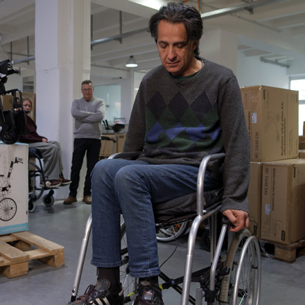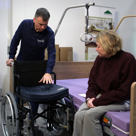 SITTING DOWN AND STANDING UP | Older wheelchair users in particular often find it difficult to sit down in a conventional wheelchair and even more difficult to stand up again and move to other surfaces such as a bed, toilet, etc. This often requires a great deal of strength and can also be a challenge for carers.