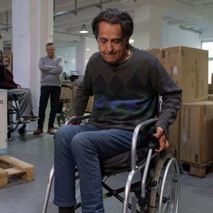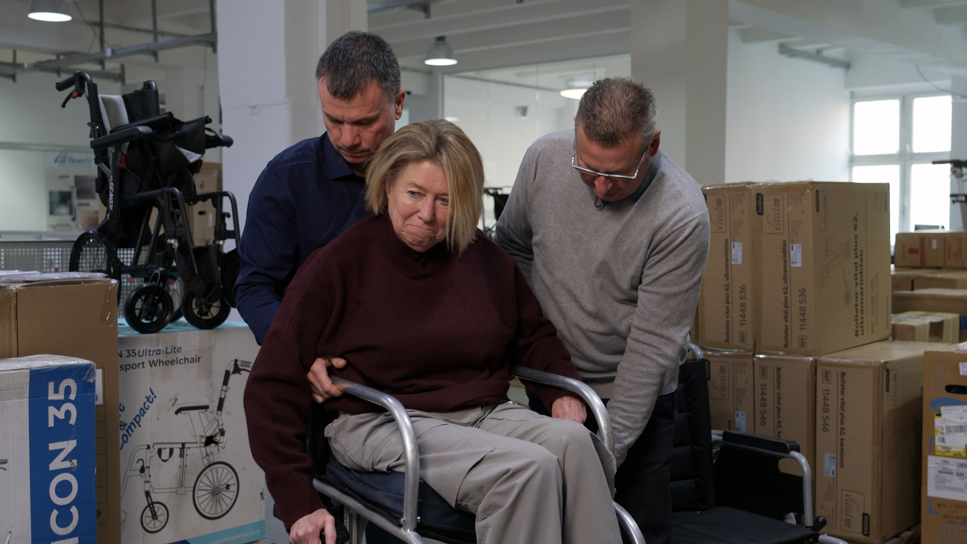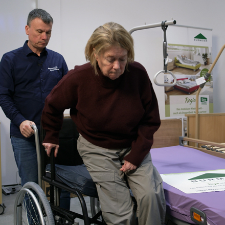 SITTING DOWN AND STANDING UP | Older wheelchair users in particular often find it difficult to sit down in a conventional wheelchair and even more difficult to stand up again and move to other surfaces such as a bed, toilet, etc. This often requires a great deal of strength and can also be a challenge for carers.
